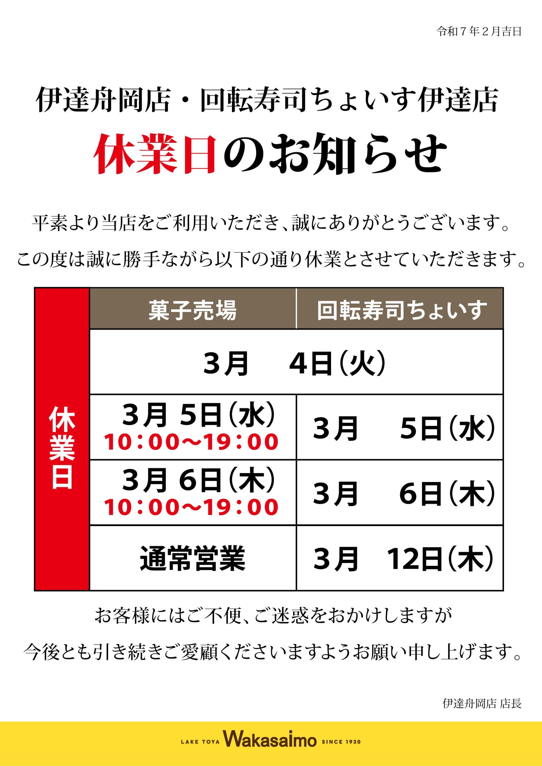 / 3月舟岡店休業日のご案内
